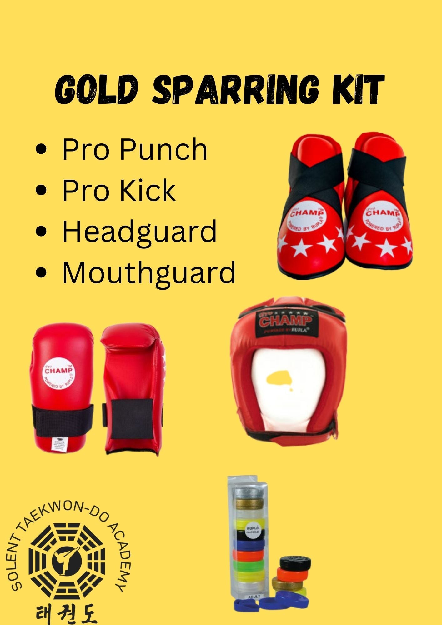 Hi all, this is the GOLD sparring kit to get you going. This pack offers a high level of protection. You get a headguard, sparring glove, foot pads and a gum shield.